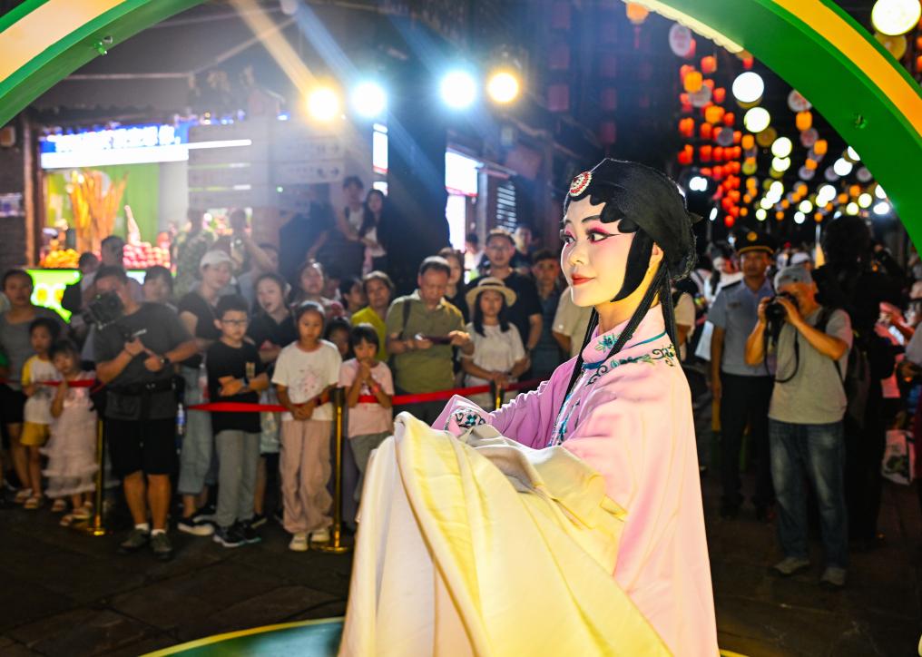 5日、重慶市磁器口古鎮で開かれた長街宴で、舞踊を披露する役者。(重慶=新華社記者/王全超)