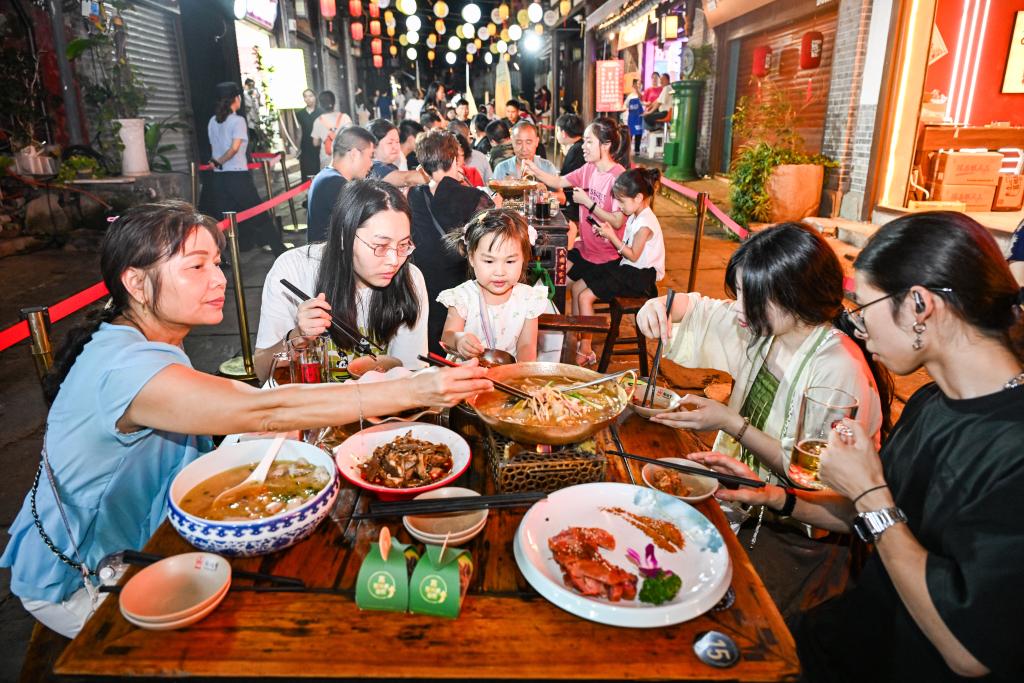5日、重慶市磁器口古鎮で開かれた長街宴で、料理を味わう人たち。(重慶=新華社記者/王全超)