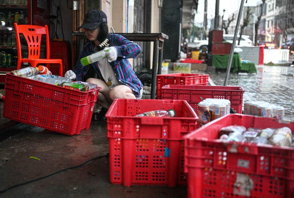 5日、海南省文昌市翁田鎮にある店の外で、被害を受けた商品をまとめるスタッフ。(文昌=新華社記者/蒲暁旭)