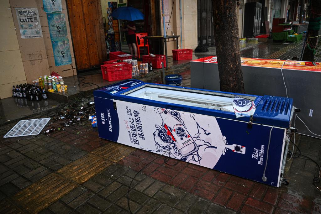 5日、海南省文昌市翁田鎮にある店の外に置かれた、強風で倒れた冷蔵庫。(文昌=新華社記者/蒲暁旭)