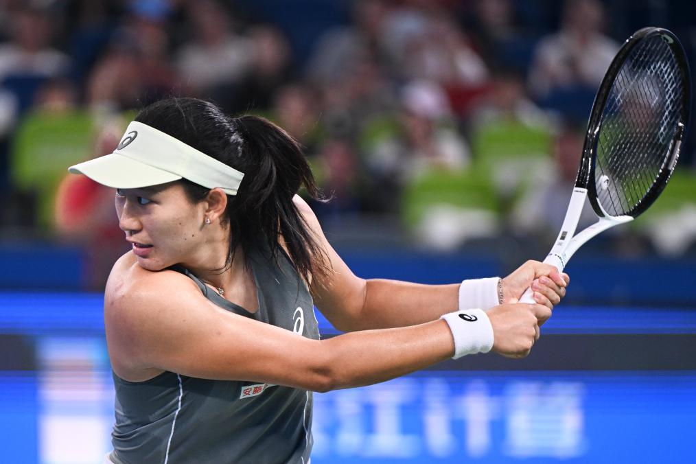 6日、武漢オープン1回戦で試合に臨む王欣瑜。(武漢=新華社記者/肖芸九)