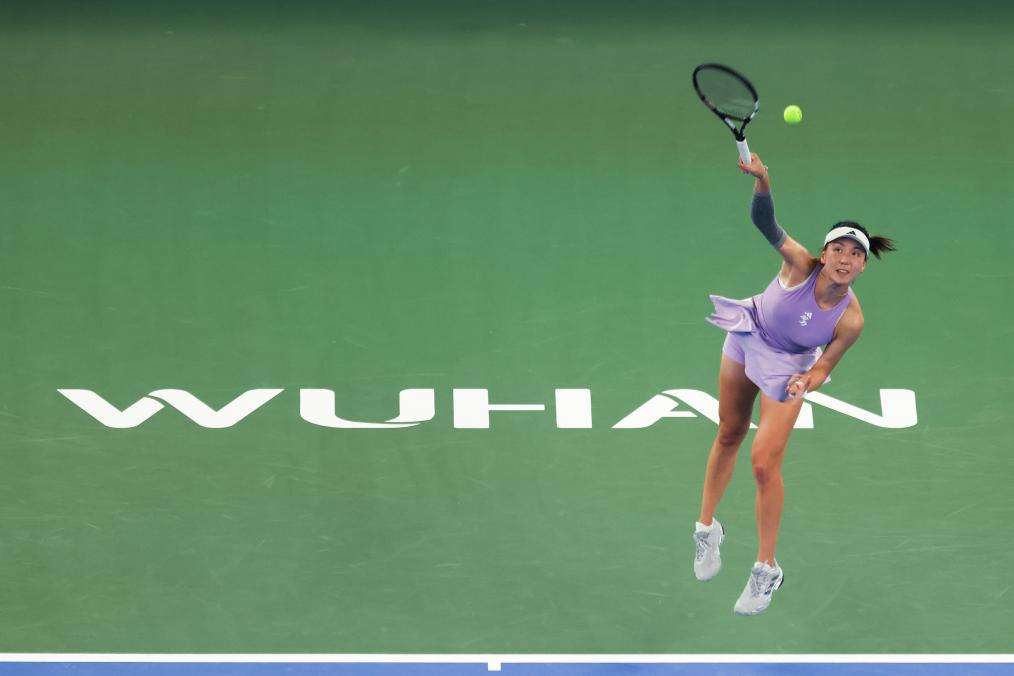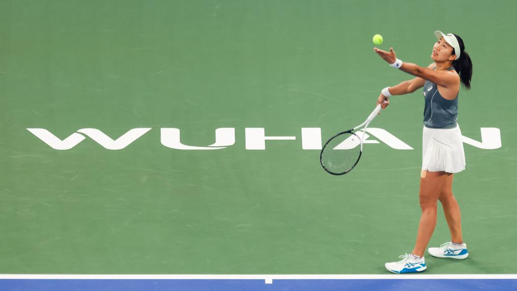 6日、武漢オープン1回戦でサーブを放つ王欣瑜。(武漢=新華社記者/肖芸九)