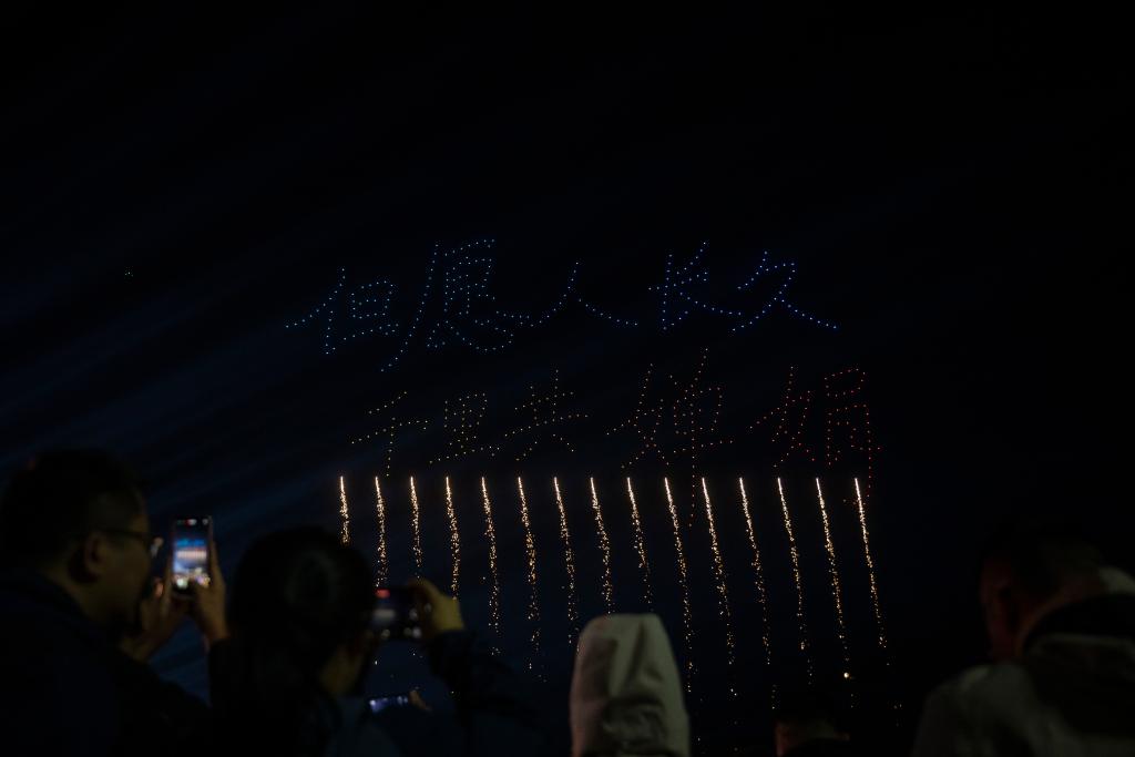 6日、黒竜江省ハルビン市の氷雪テーマパーク「氷雪大世界」で行われたドローンショー。(ハルビン=新華社記者/張濤)