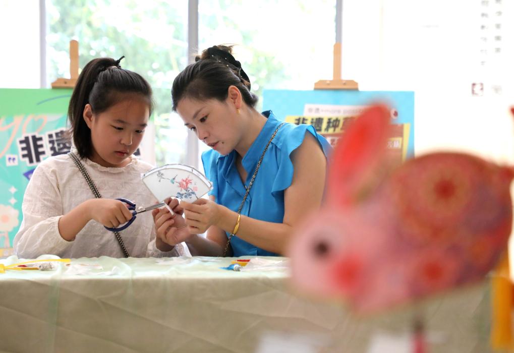 6日、四川省内江市東興区で、中秋節のちょうちん作りに参加した親子。(内江=新華社配信/唐明潤)