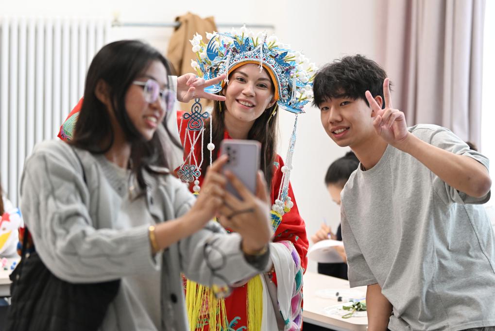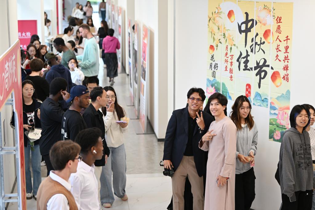 6日、天津師範大学で中秋節の国際交流イベントに参加し、撮影を楽しむ学生ら。(天津=新華社記者/李然)