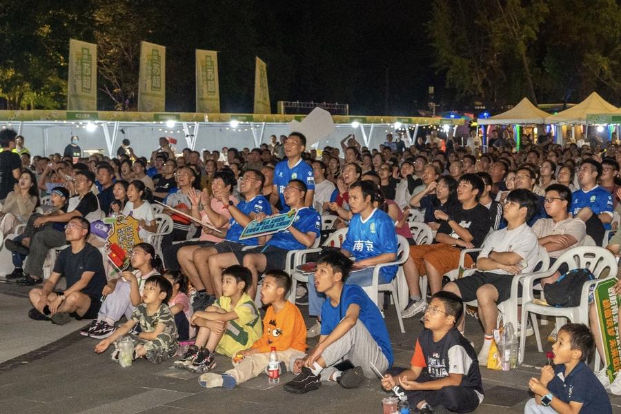 4日、江蘇省南京市の屋外広場の大型スクリーン前で、「蘇超」の試合を観戦する市民や観光客。(南京=新華社配信)