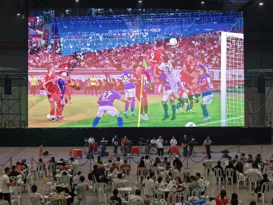 5日、江蘇省徐州市の広場にある大型スクリーンの前で、「蘇超」の試合を見ながらグルメや音楽を楽しむ市民や観光客。(徐州=新華社配信)