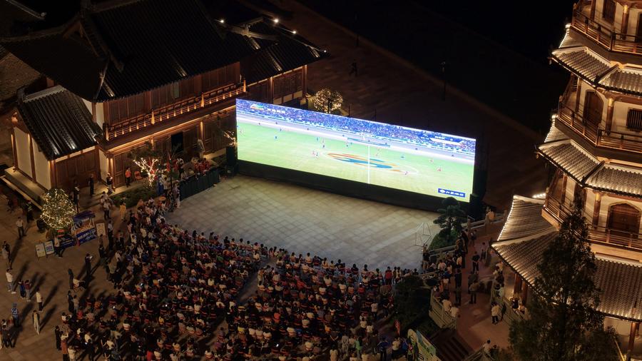 4日、江蘇省南京市の文化・観光地区に設置された大型スクリーン前で、「蘇超」の試合を観戦する市民や観光客。(南京=新華社配信)