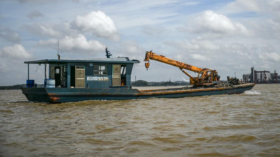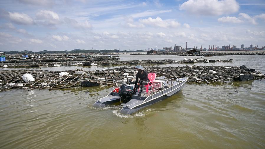 7日、カキの養殖いかだの修復に向かう修理船。(欽州=新華社記者/張愛林)
