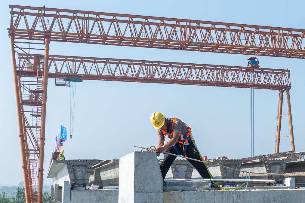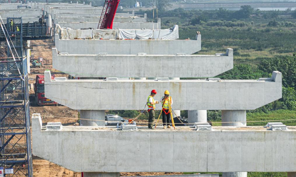 【新華社武漢10月8日】中国湖北省で整備が進む「武漢都市圏環状高速道路」で、西部に位置する孝感南区間の建設作業が続いている。中秋節に当たる6日も、建設を請け負う中鉄二十局集団の作業員200人余りが現場に立ち、コンクリート製の箱桁を高架区間に据え付ける作業を進めた。