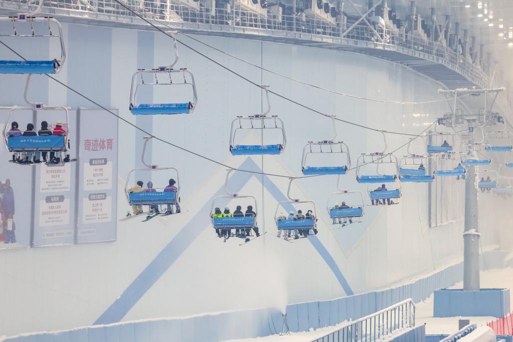 7日、「深圳・前海氷雪世界」でリフトに乗って移動する人々。(深圳=新華社記者/梁旭)