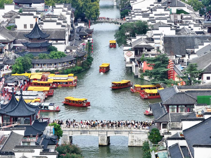 8日、観光客でにぎわう江蘇省南京市の孔子廟「南京夫子廟」。(ドローンから、南京=新華社配信/劉建華)
