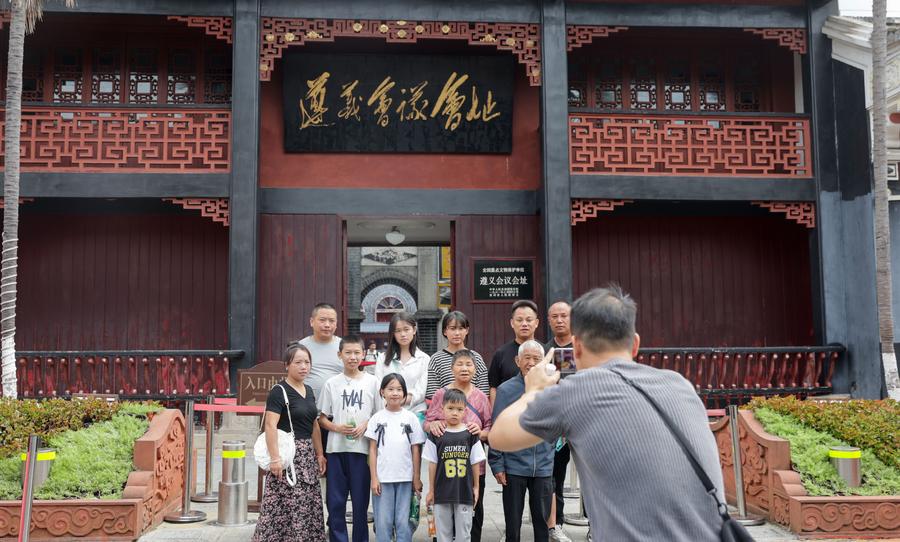 8日、貴州省遵義市の遵義会議会場跡で記念撮影する観光客。(遵義=新華社配信/袁福洪)