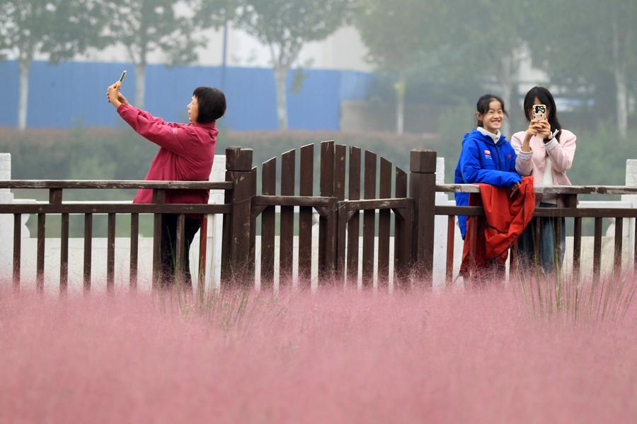 8日、河南省許昌市の清潩河畔に設けられたピンクミューリーの花畑で写真を撮る観光客。(許昌=新華社配信/牛書培)