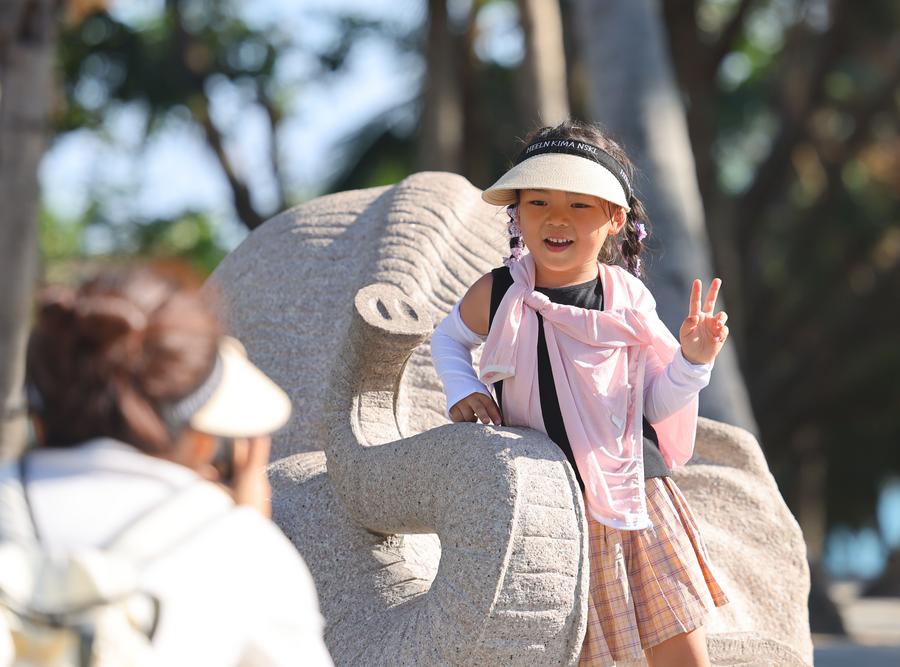 8日、海南省三亜市の南山文化観光区で記念撮影する親子。(三亜=新華社配信/陳文武)