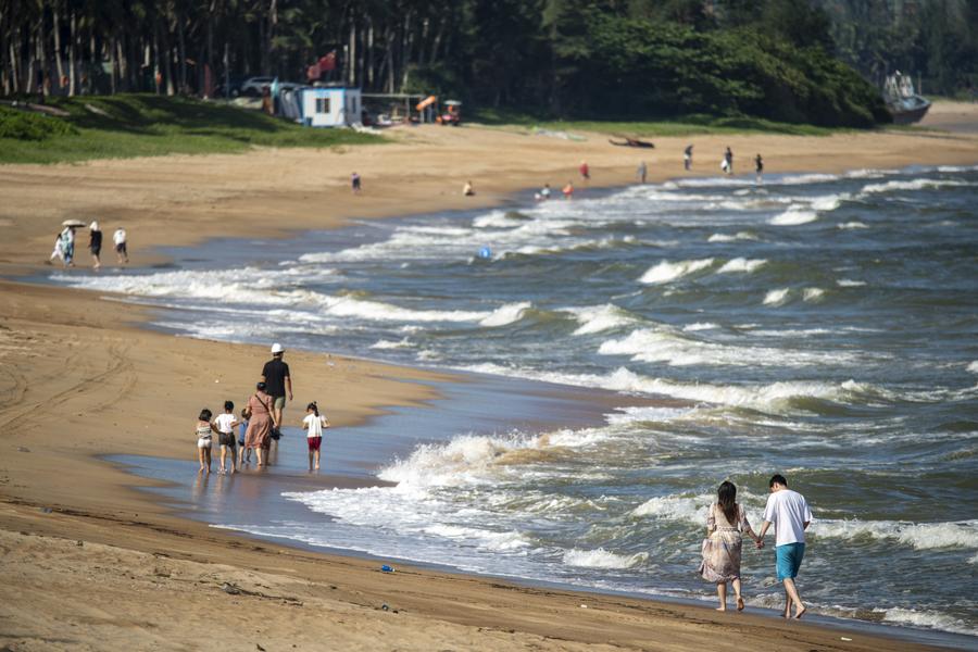 8日、海南省瓊海(けいかい)市博鰲(ボアオ)鎮のビーチで遊ぶ観光客。(瓊海=新華社配信/蒙鍾徳)
