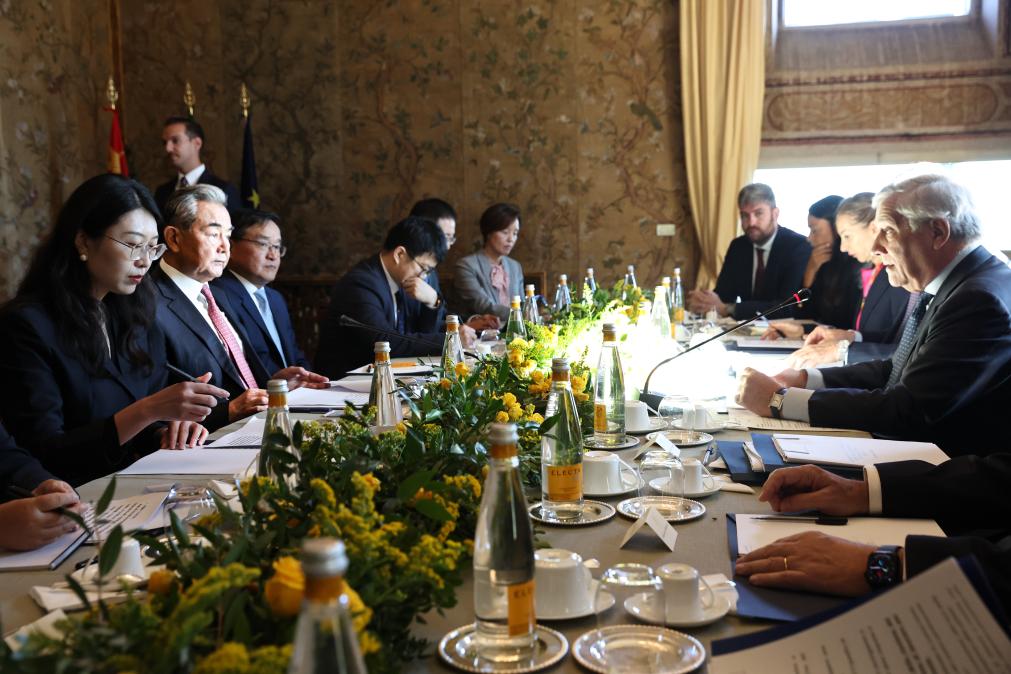 8日、タヤーニ氏と会談する王毅氏。(ローマ=新華社記者/李京)