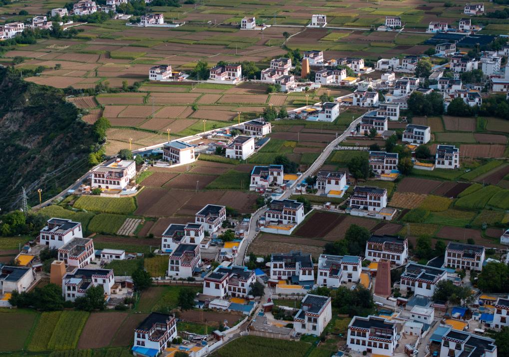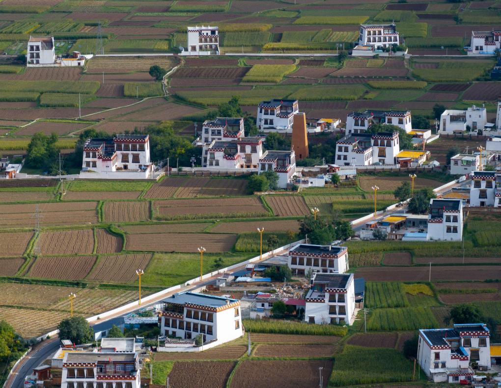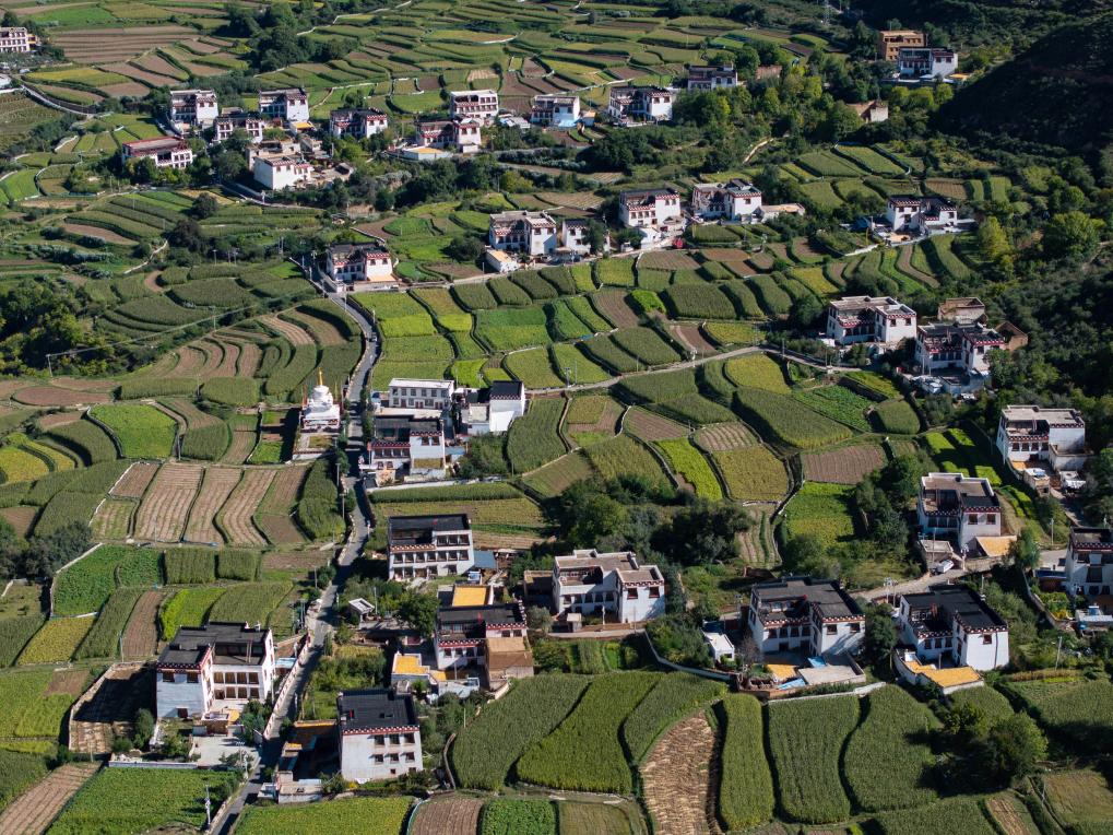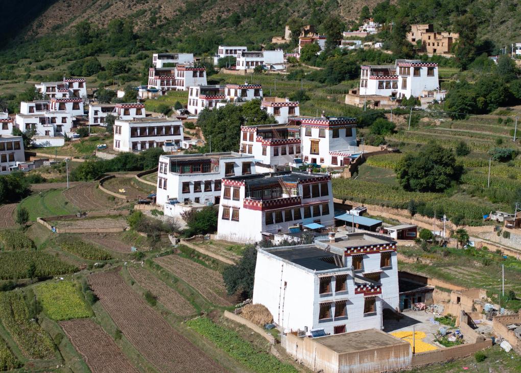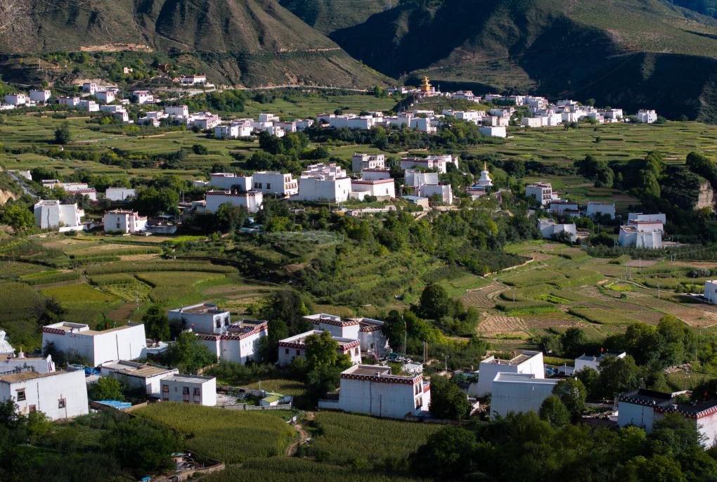 四川省ガンゼ・チベット族自治州郷城県青徳鎮の仲徳村に並ぶ白蔵房。(9月20日、ドローンから、ガンゼ=新華社記者/江宏景)