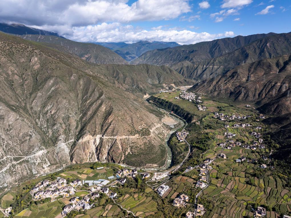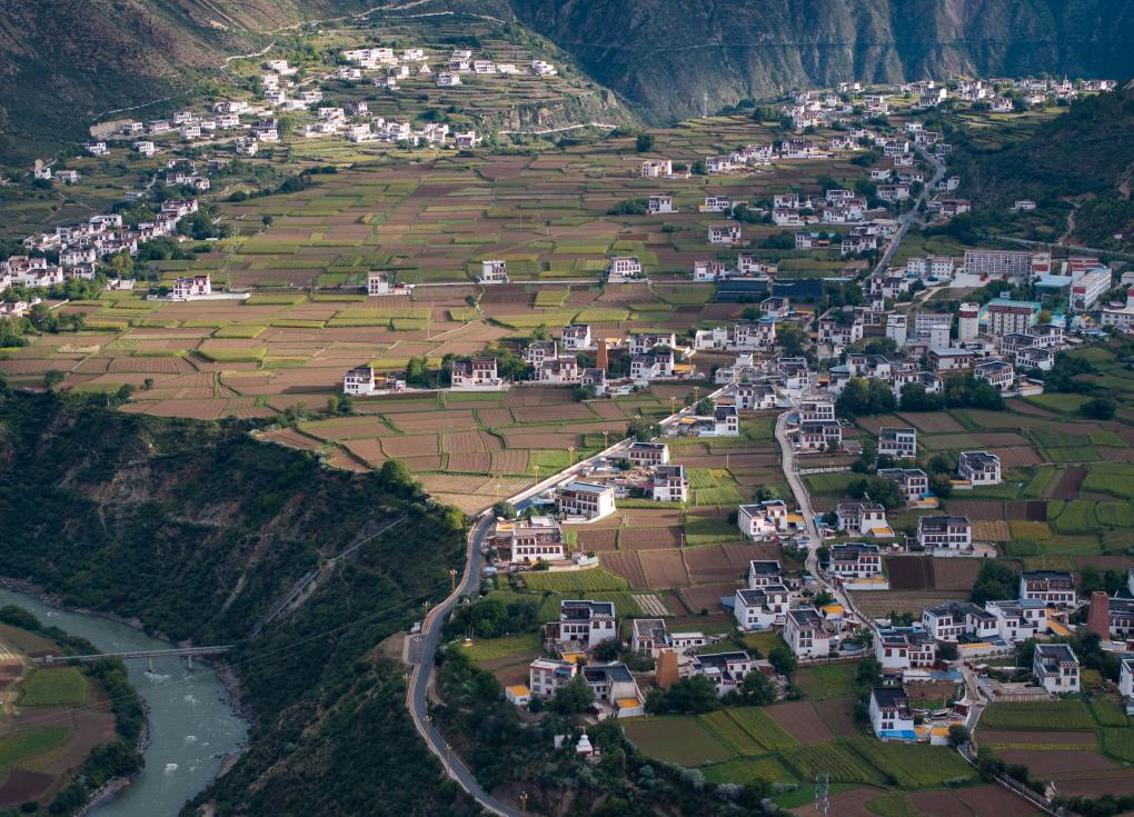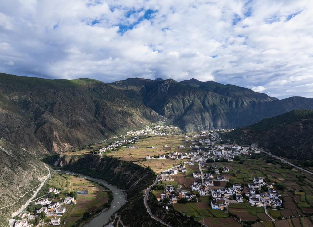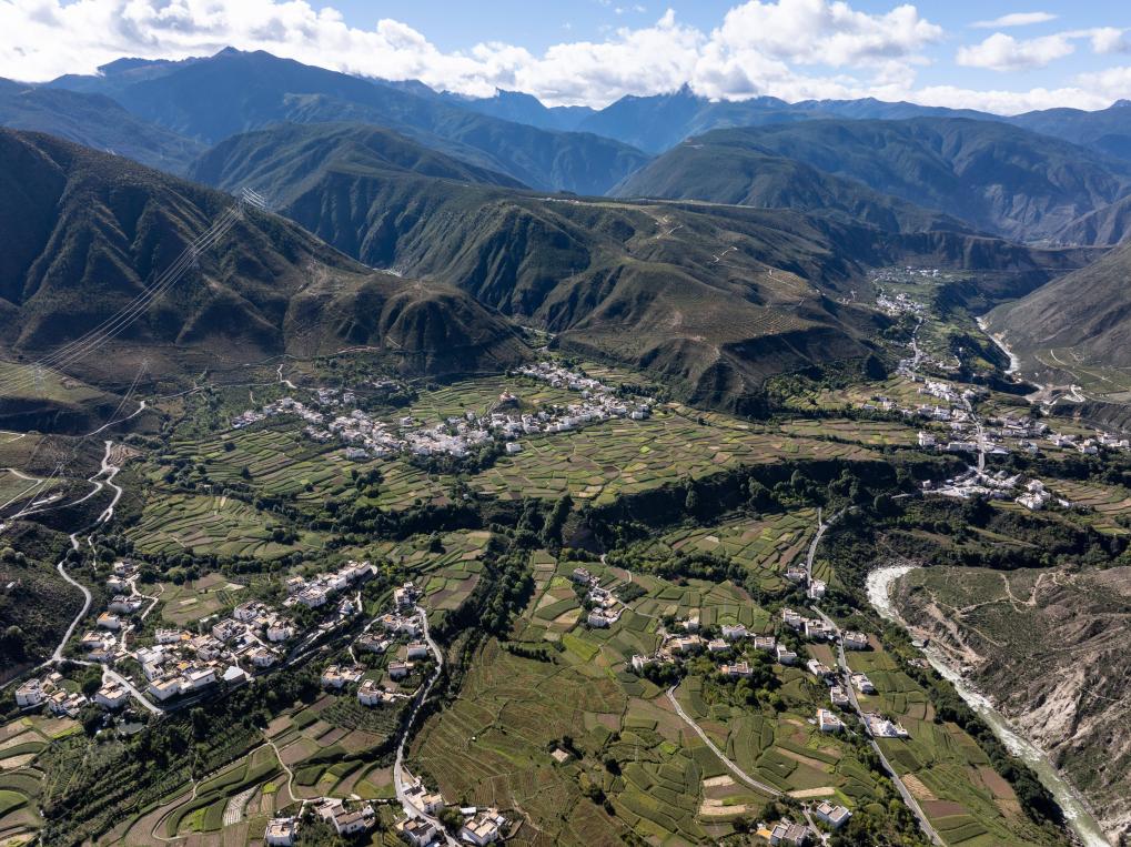 四川省ガンゼ・チベット族自治州郷城県青徳鎮の仲徳村に並ぶ白蔵房。(9月20日、ドローンから、ガンゼ=新華社記者/江宏景)