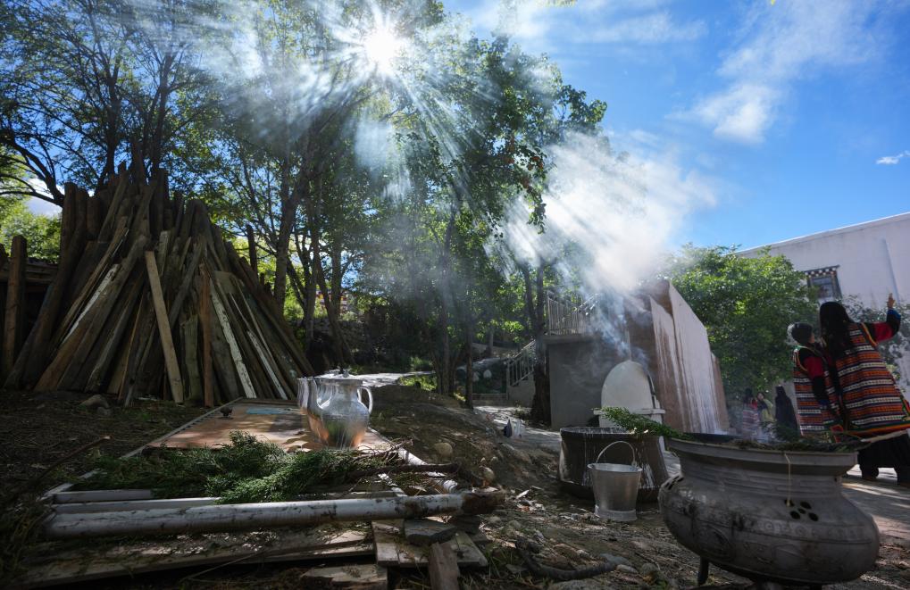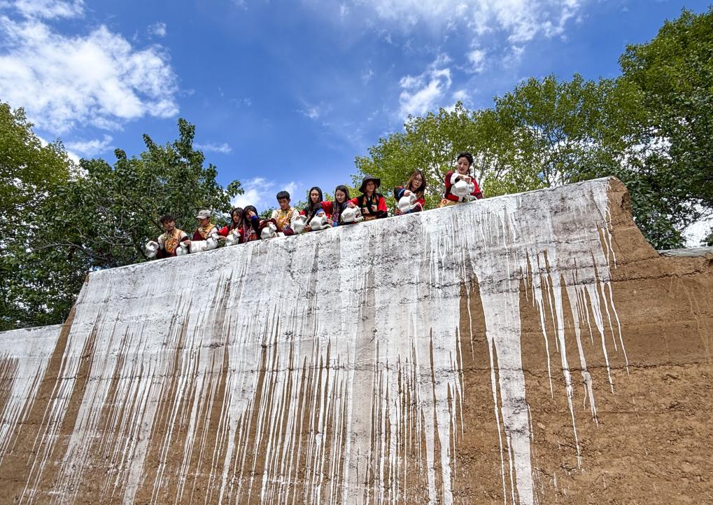 四川省ガンゼ・チベット族自治州郷城県青徳鎮の仲徳村で行われた、観光客向けの「白色灌礼」体験サービス。(9月21日撮影、ガンゼ=新華社記者/江宏景)