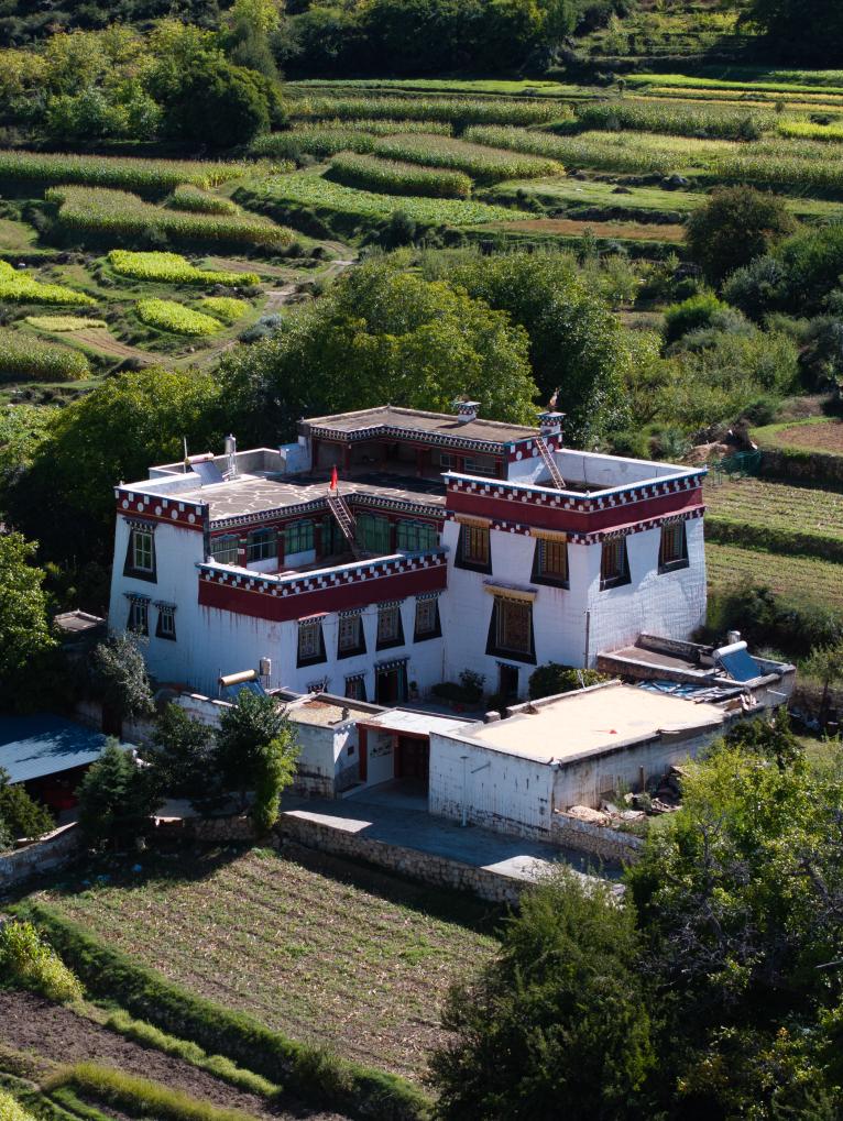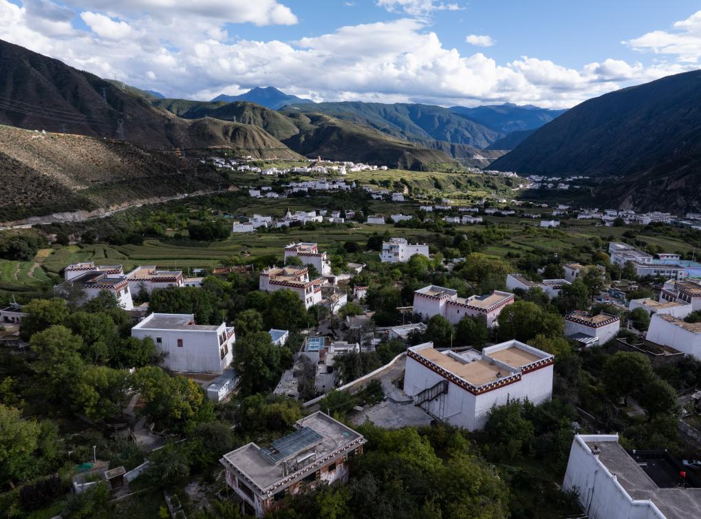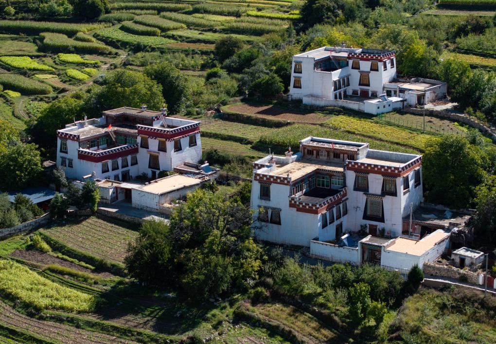 四川省ガンゼ・チベット族自治州郷城県青徳鎮の仲徳村にある白蔵房。(9月21日、ドローンから、ガンゼ=新華社記者/江宏景)