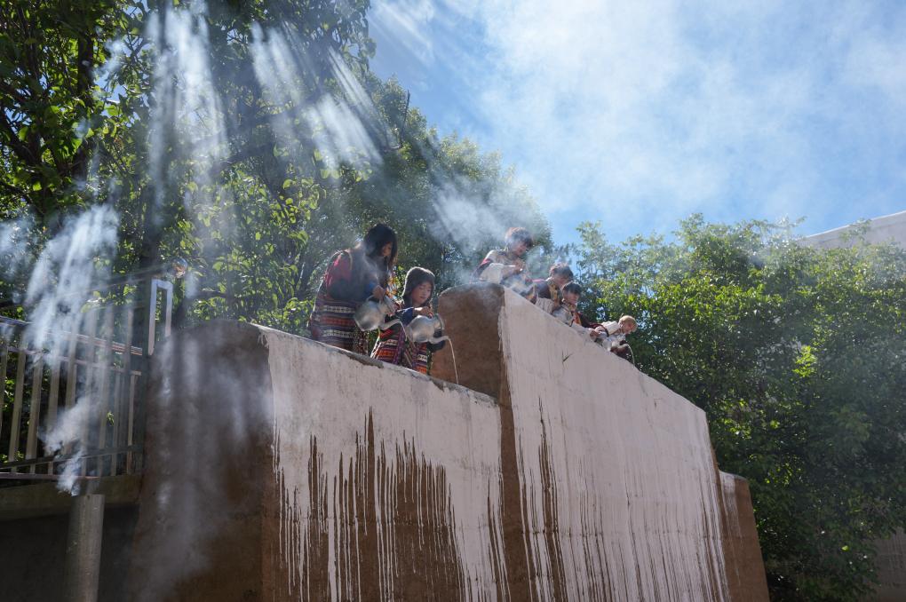 毎年秋の風物詩となっているのが「白色灌礼(かんれい)」と呼ばれる再塗装の儀式だ。地元では9月になると、住民が山から採取した「阿戈土」を水と混ぜて白い泥漿を作り、急須などに入れて壁面へと丁寧に注ぎかける。塗料は美観を保つだけでなく、雨を防ぐ役割も果たす。