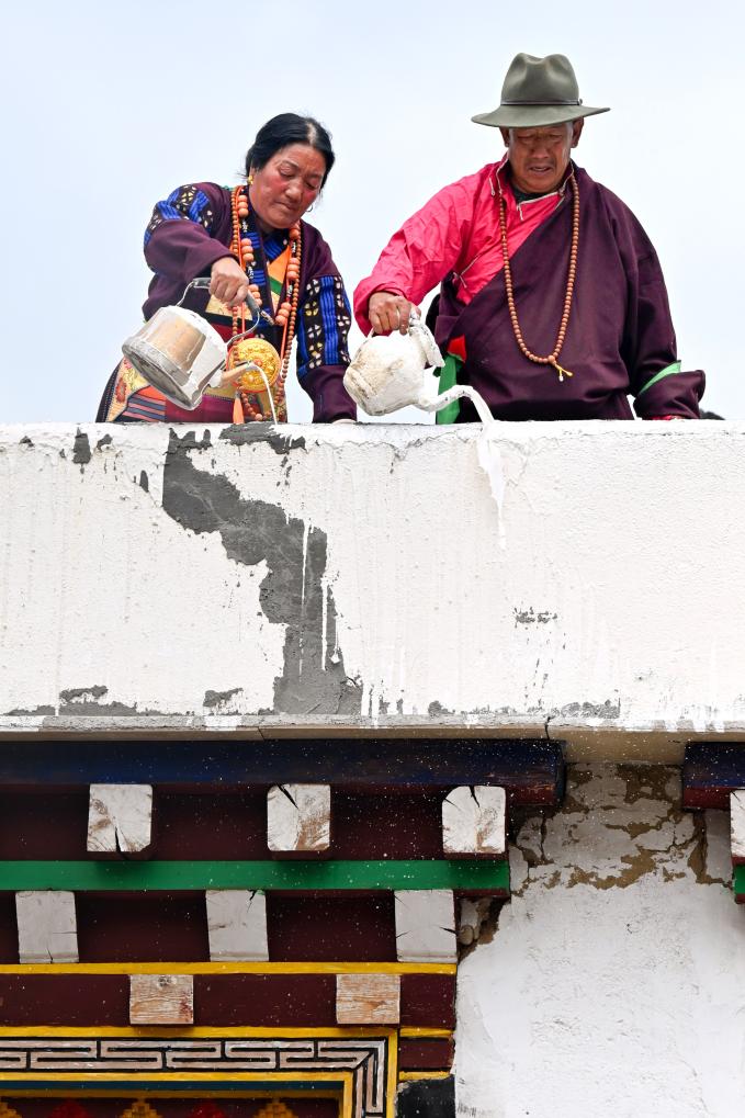 四川省ガンゼ・チベット族自治州郷城県青徳鎮の仲徳村で、自宅に「白い灌礼」を施す夫婦。(9月20日撮影、ガンゼ=新華社記者/江宏景)
