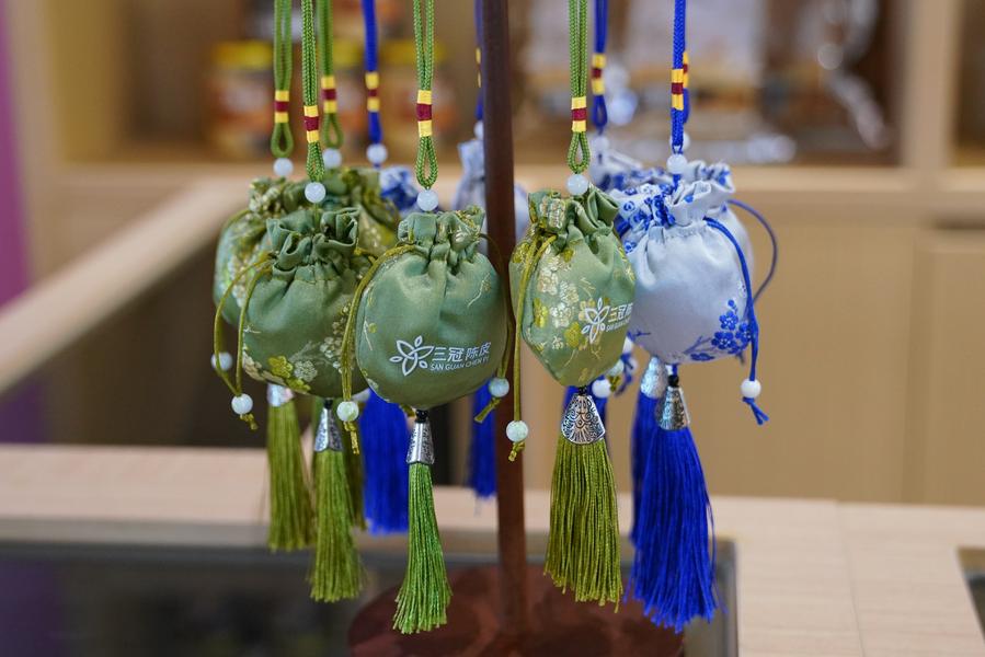 9月28日、浦北県産の陳皮で作られた匂い袋。(南寧=新華社記者/趙歓)