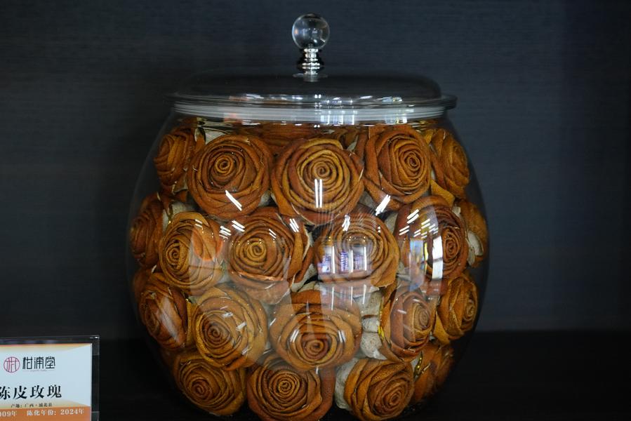 浦北県の陳皮産業パークでは、大紅柑の果実の価値が広がり続けている。地元の食品メーカー、広西中皮健康産業の展示ホールには、陳皮月餅や陳皮ピーナッツ、陳皮飲料などの製品がずらりと並ぶ。同社の彭瀟(ほう・しょう)董事長補佐は大紅柑について、全体が宝で捨てるところがないと強調。「陳皮を作るだけでなく、果汁飲料やスナック菓子も開発し、倉庫保管や金融、保険などの分野にも事業を広げた。『全チェーン開発』によって、大紅柑の経済的な潜在力を最大限に引き出している」と語った。