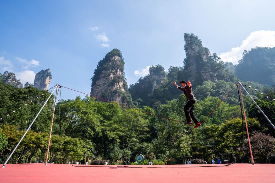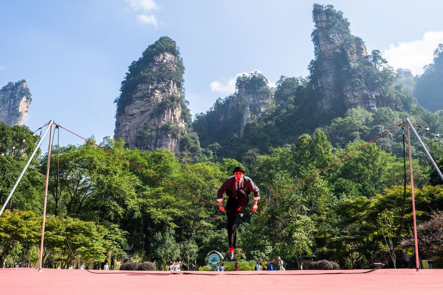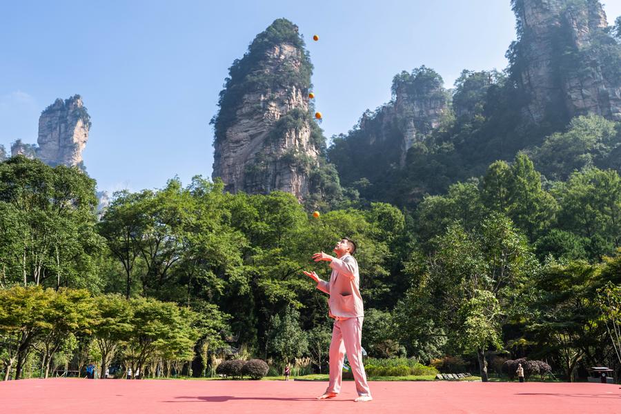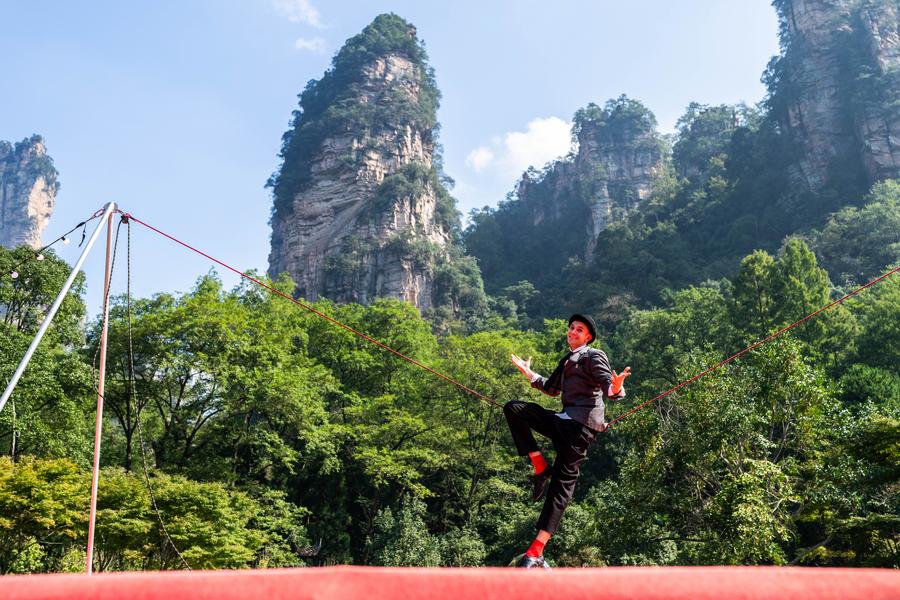 11日、張家界国家森林公園で、雑技を披露するチリの演者。(長沙=新華社記者/陳思汗)