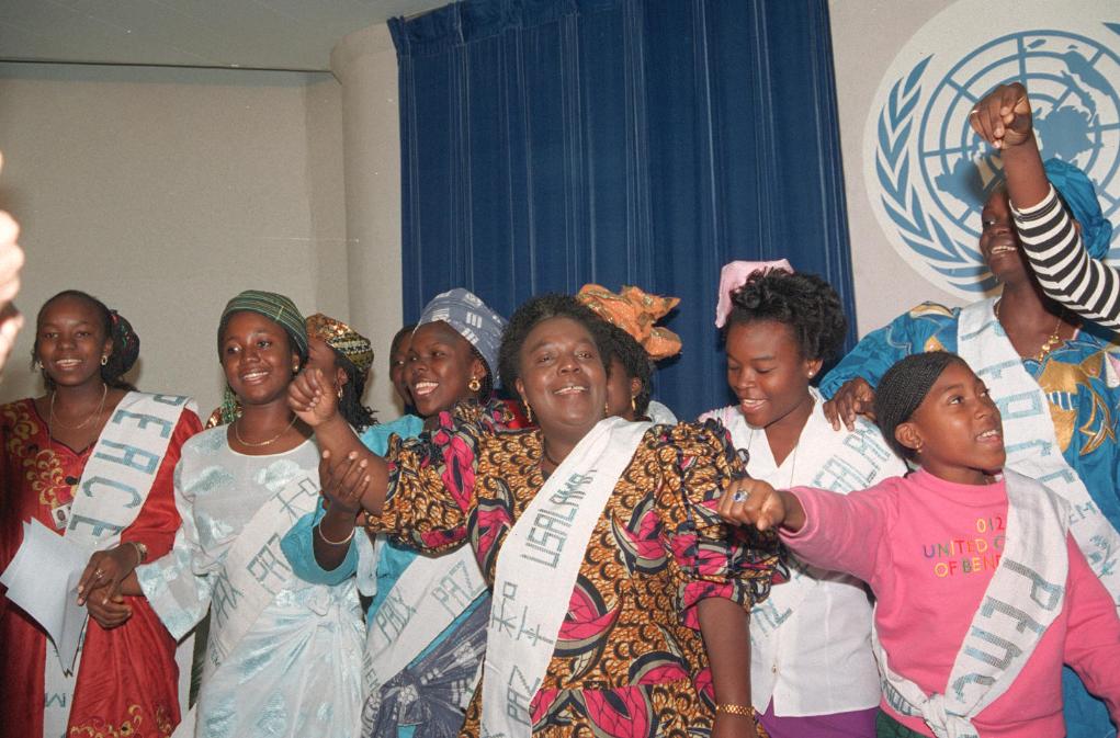 北京女性会議の「青年デー」で、アフリカ各国の女性らと歌を歌うモンゲラ氏(前列右から2人目)。(1995年9月11日撮影、北京=新華社記者/張耀智)