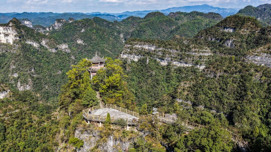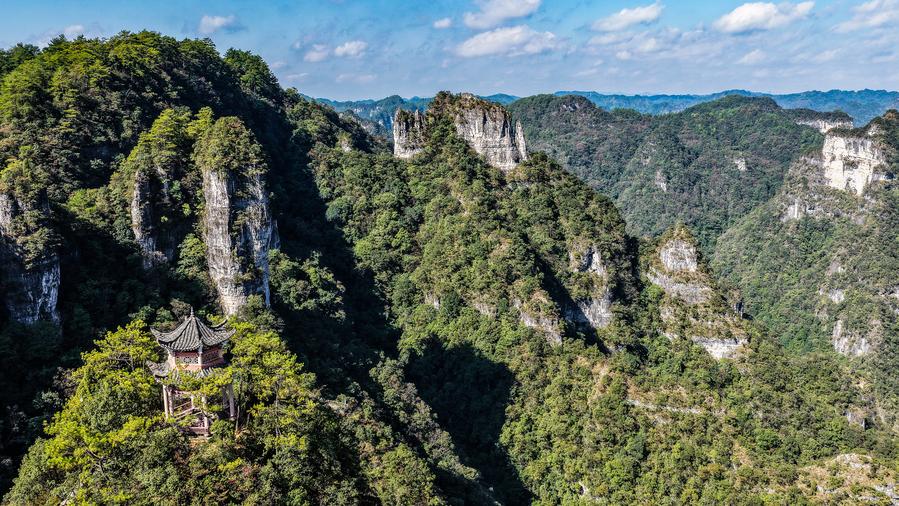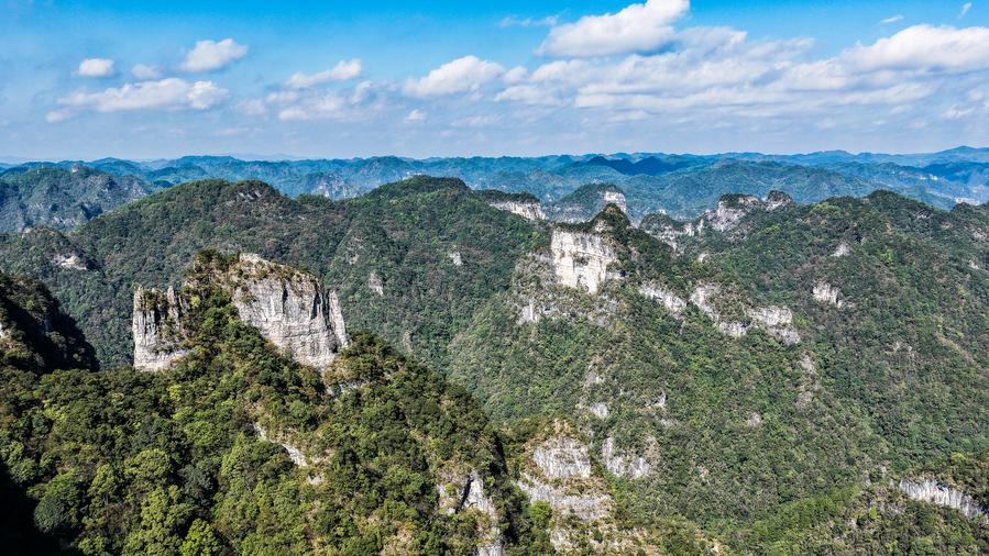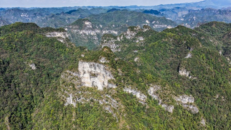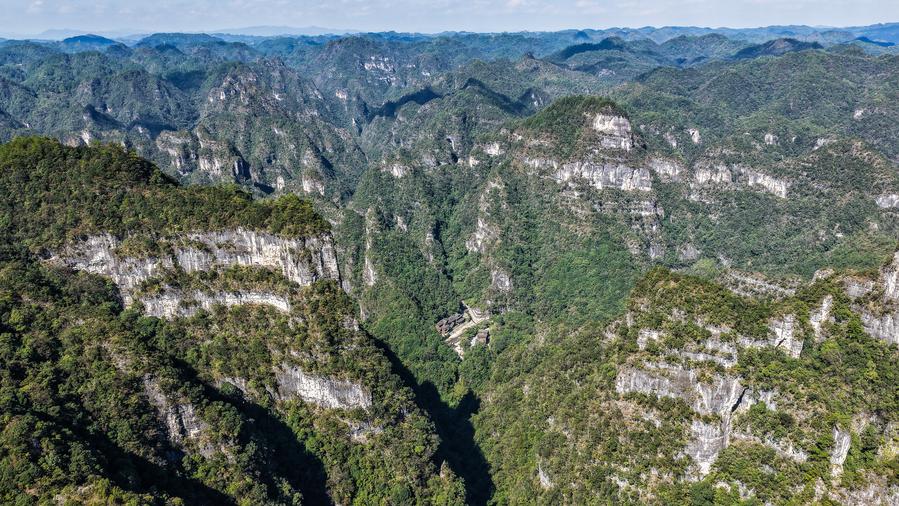 11日、雲台山風景区の景色。(ドローンから、施秉=新華社記者/陶亮)