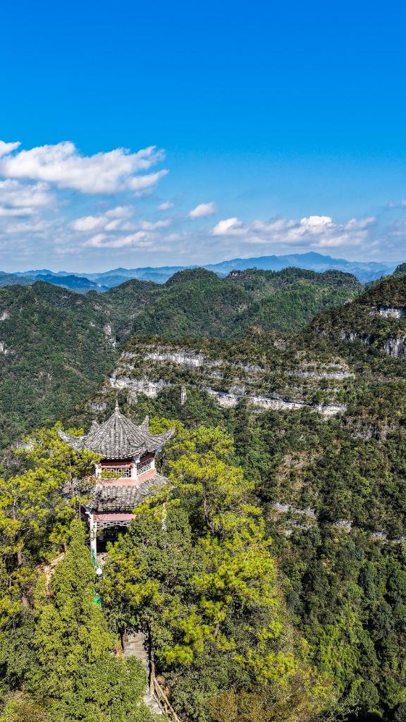 【新華社施秉10月12日】中国貴州省黔東南(けんとうなん)ミャオ族トン族自治州施秉(しへい)県の雲台山風景区で、すがすがしい秋晴れの景色が広がり、青い空と白い雲、山々が壮大な絵巻を描き出した。