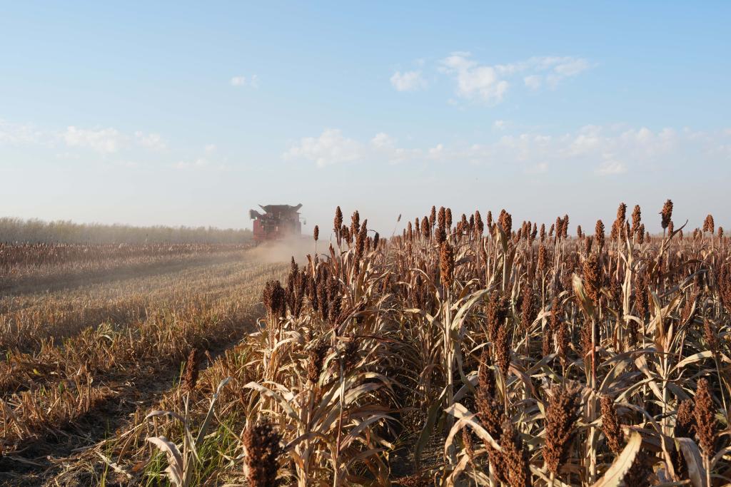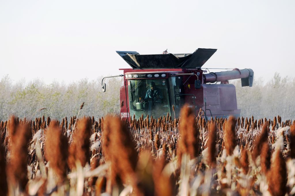 11日、黒竜江省肇東(ちょうとう)市にある北大荒農墾集団傘下の四方山農場でコーリャンを収穫する農機。(ハルビン=新華社記者/王松)