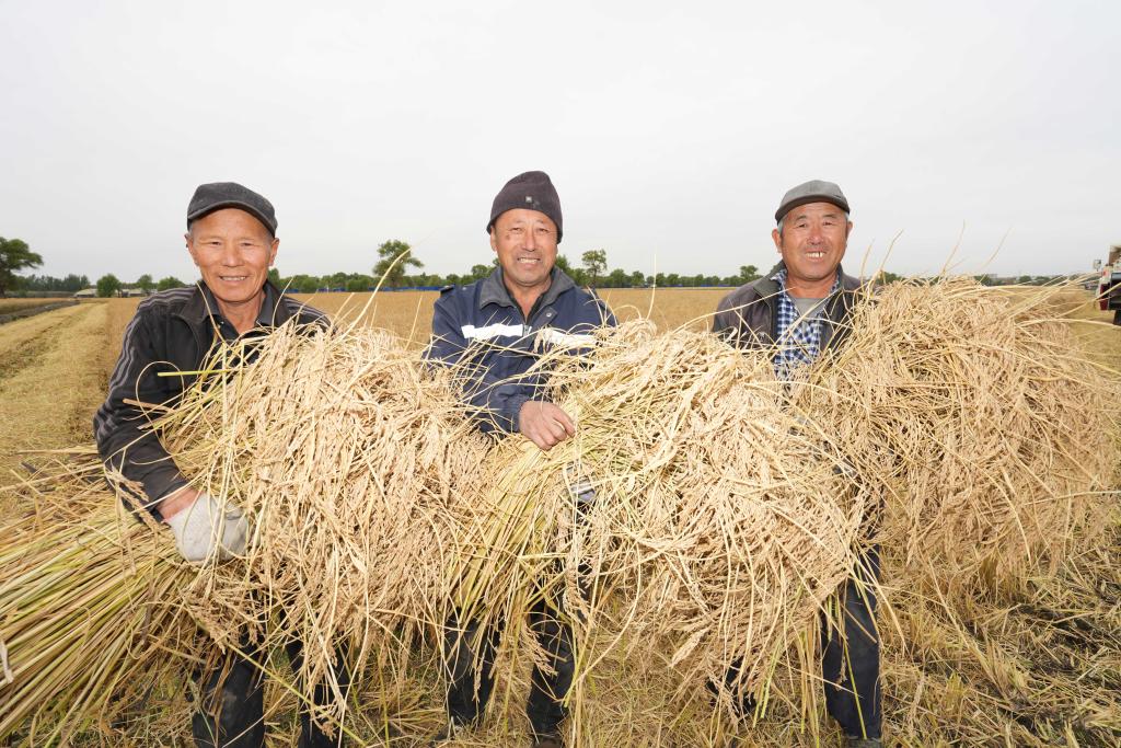 11日、黒竜江省ハルビン市にある北大荒農墾集団傘下の閆家崗(えんかこう)農場で収穫したイネを抱える農家の人。(ハルビン=新華社記者/王松)