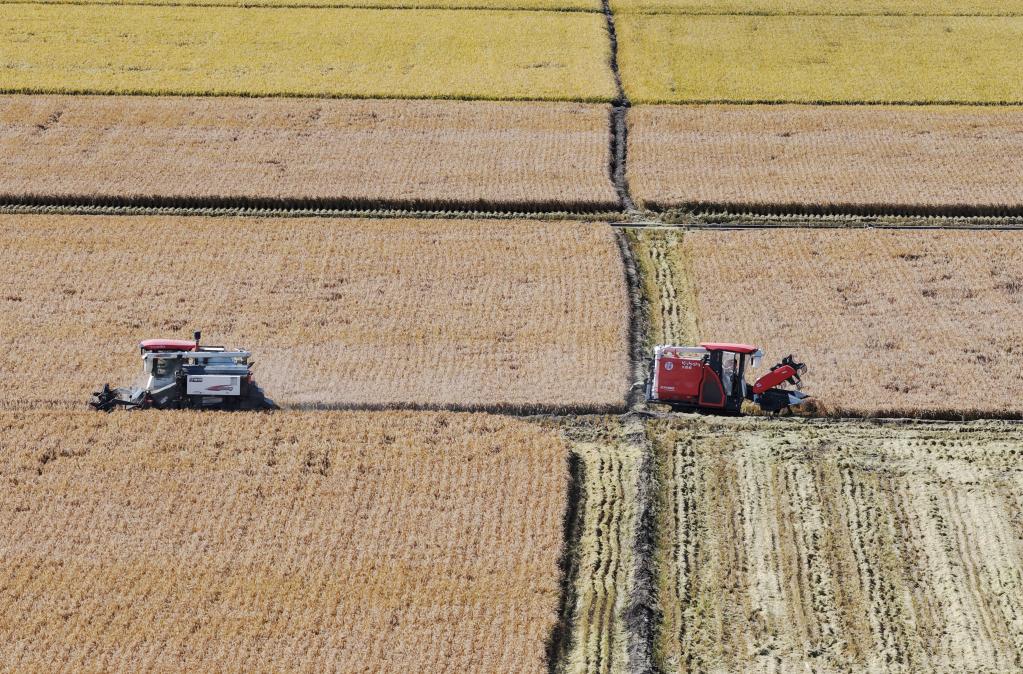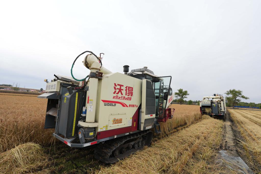 黒竜江省双鴨山市にある北大荒集団傘下の友誼農場でイネを刈り取る農機。(9月23日撮影、ハルビン=新華社記者/王松)