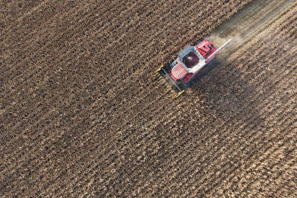 11日、黒竜江省肇東(ちょうとう)市にある北大荒農墾集団傘下の四方山農場でトウモロコシを収穫する農機。(ドローンから、ハルビン=新華社記者/王松)