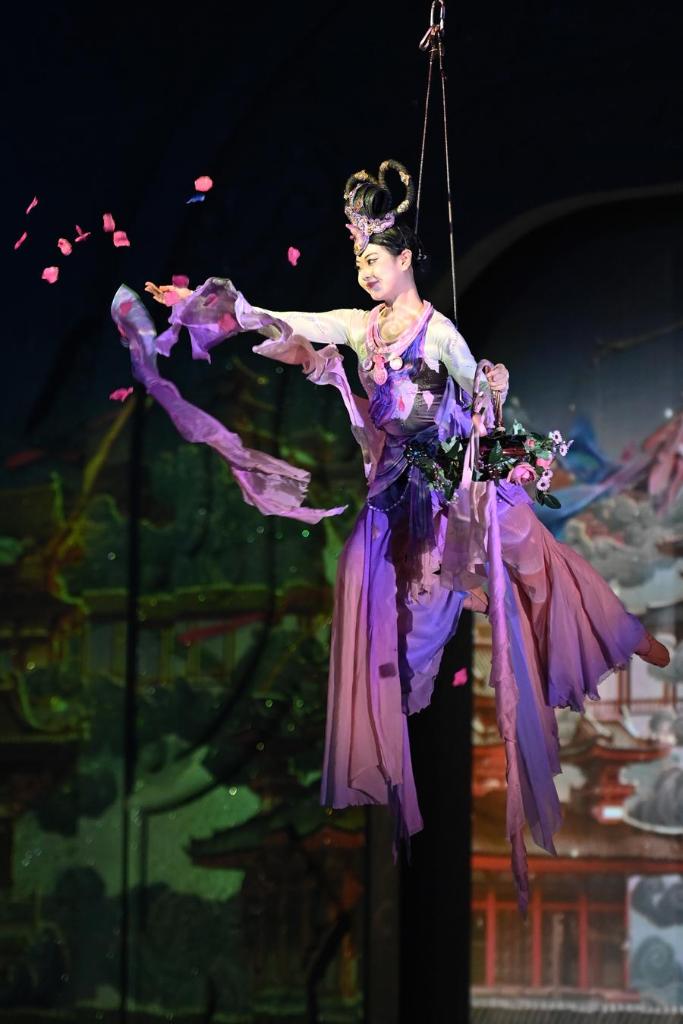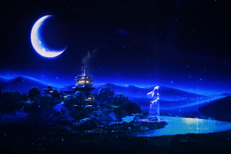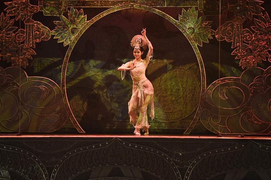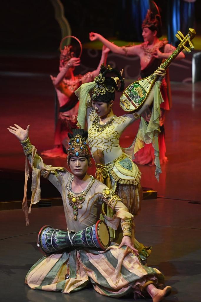 「楽動敦煌」は莫高窟(ばっこうくつ)壁画や蔵経洞から見つかった古文書の内容、楽器・楽譜の研究成果を生かし、映像投影などの技術と俳優の演技によって壁画に描かれた音楽と舞踊を生き生きと再現している。観客は千年にわたり伝承されてきた敦煌文化の魅力に浸っていた。