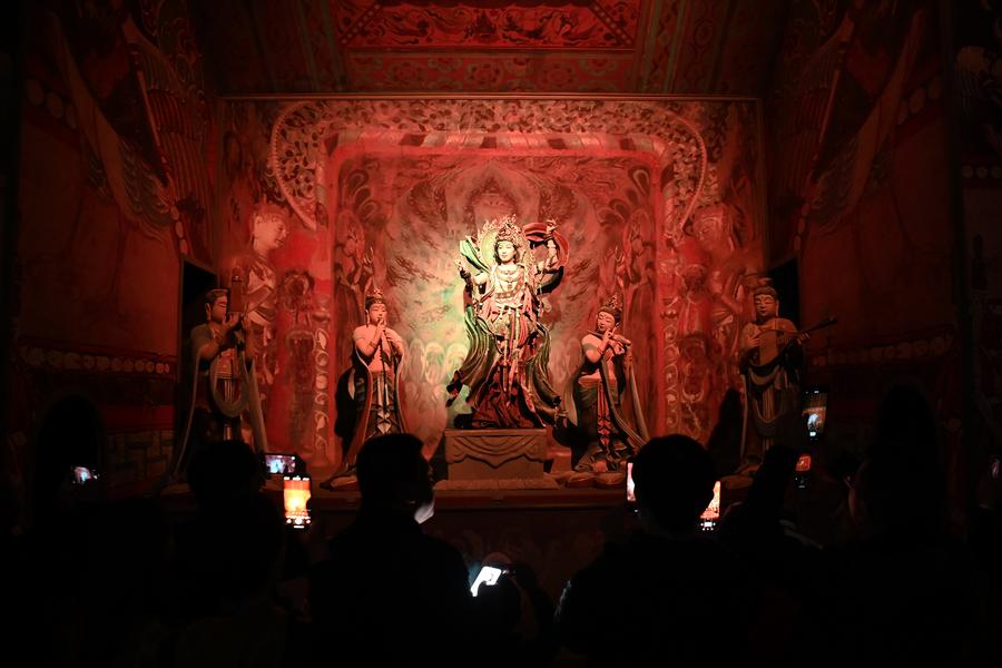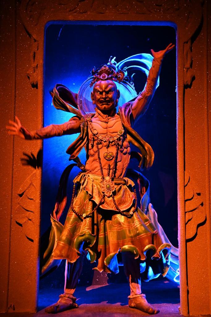 12日、石窟の雰囲気を表現した没入型演劇「楽動敦煌」の一場面。(敦煌=新華社記者/范培珅)