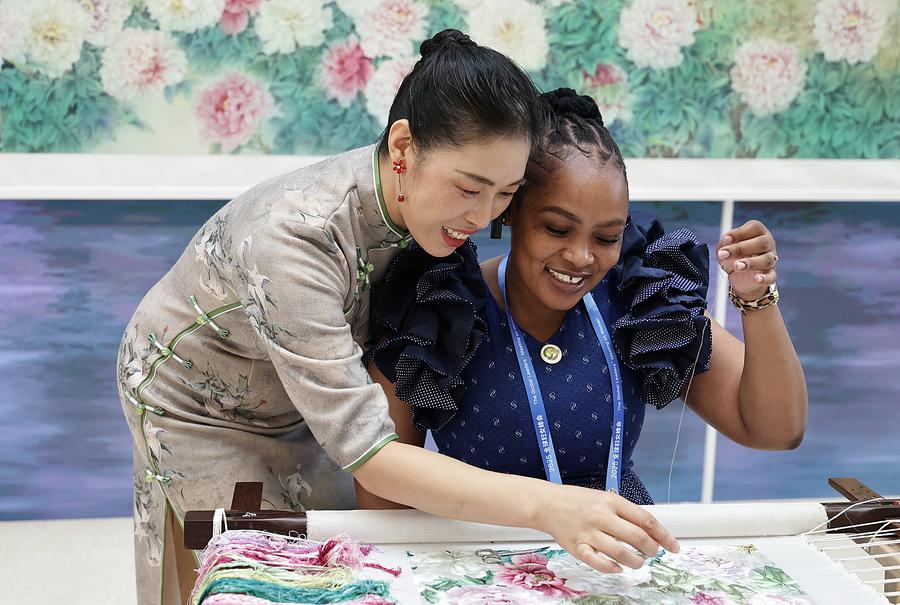 14日、女性・女児エンパワーメント展で中国の刺繍(ししゅう)を体験するボツワナからの来賓(右)。(北京=新華社記者/張玉薇)
