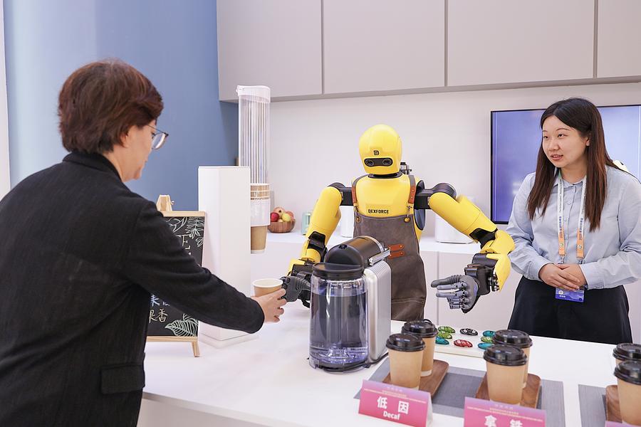 14日、女性・女児エンパワーメント展で、ロボットが入れたコーヒーを受け取る来場者(左)。(北京=新華社記者/張玉薇)