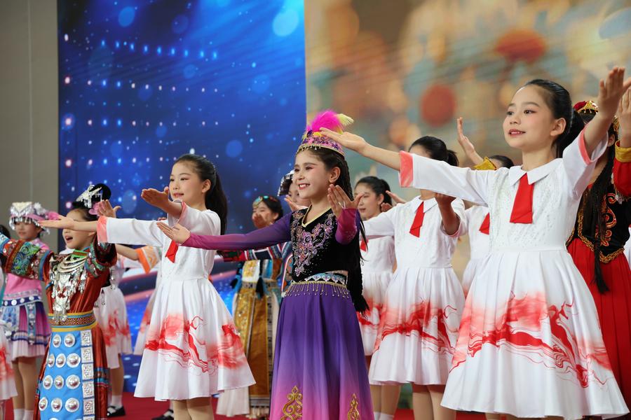 14日、女性・女児エンパワーメント展で歌う合唱団の子どもたち。(北京=新華社記者/梁旭)