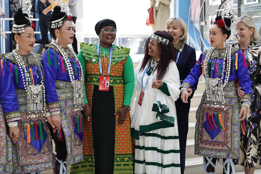 14日、女性・女児エンパワーメント展で、トン族大歌を披露した出演者と交流するロシアからの来賓(右から3人目)。(北京=新華社記者/梁旭)