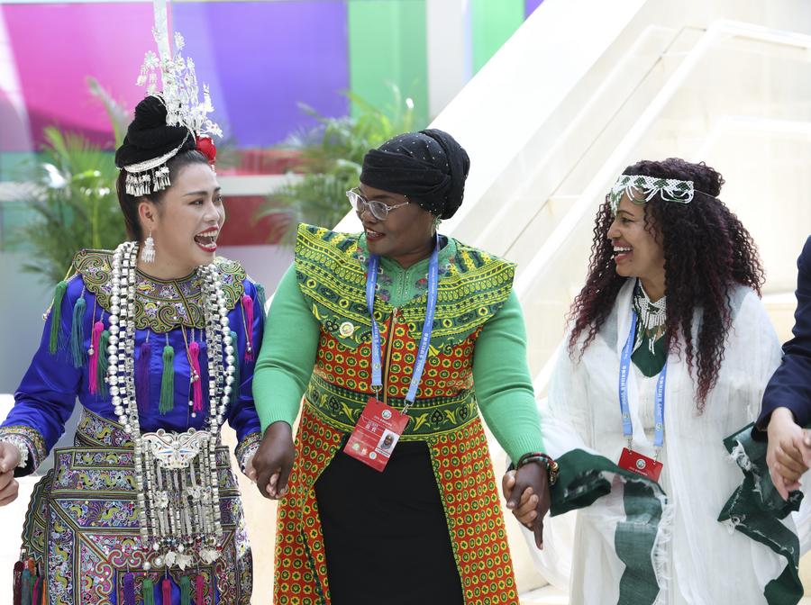 14日、女性・女児エンパワーメント展で、トン族大歌を披露した出演者と一緒に踊るタンザニアとエチオピアからの来賓。(北京=新華社記者/梁旭)