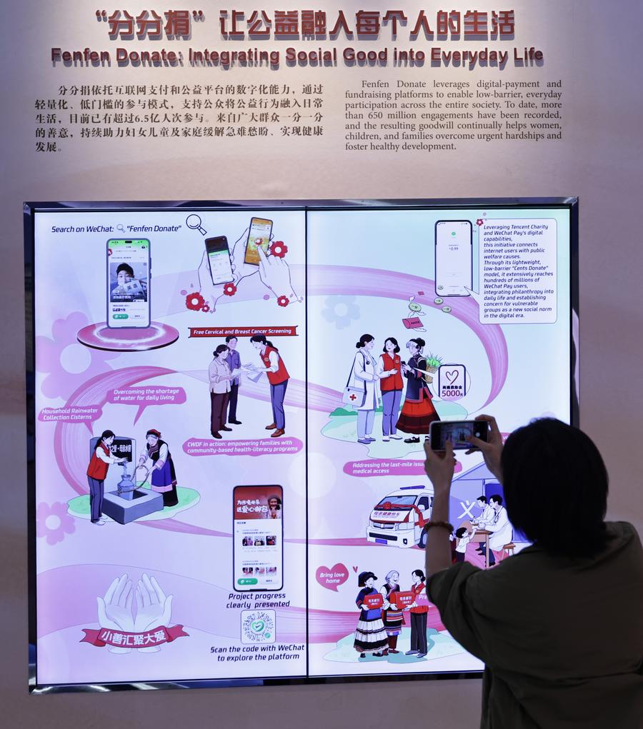14日、女性・女児エンパワーメント展で公益プロジェクトのパネルを撮影する来賓。(北京=新華社記者/張玉薇)