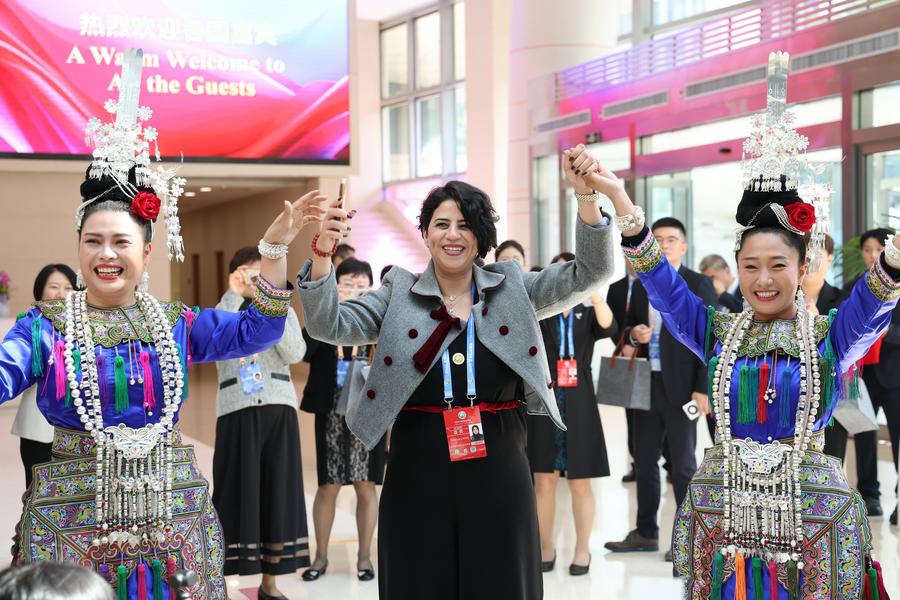 14日、女性・女児エンパワーメント展で、トン族大歌を披露した出演者と踊るアルジェリアからの来賓(中央)。(北京=新華社記者/梁旭)
