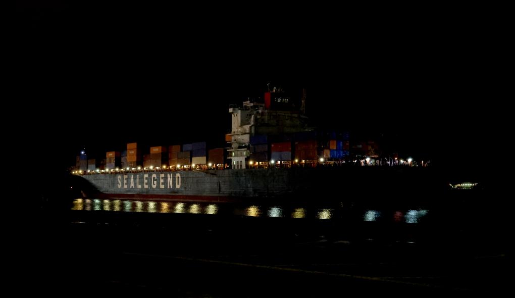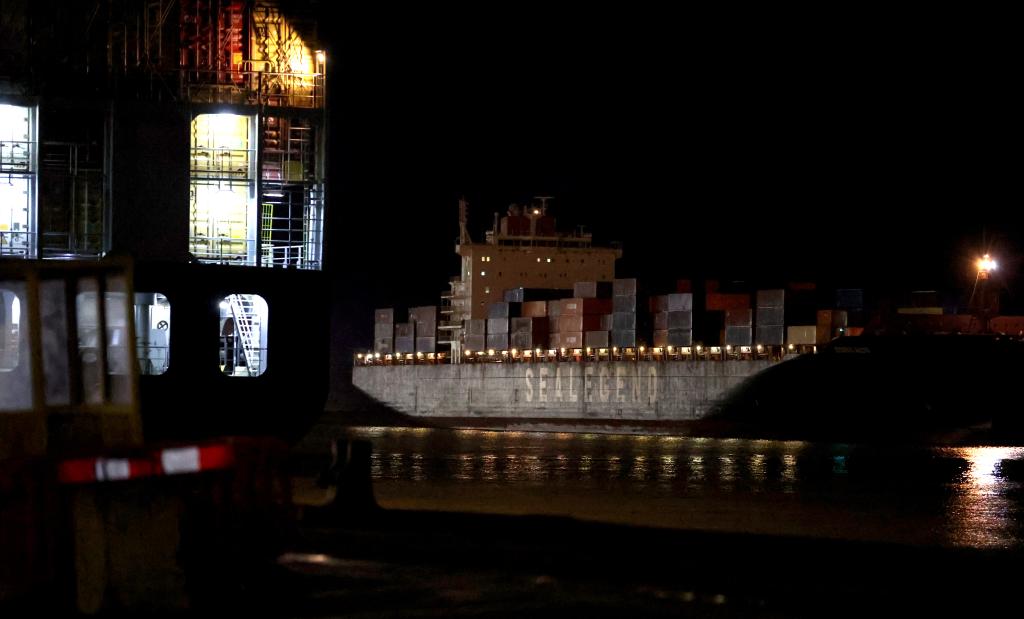 13日、英国のフェリクストウ港の埠頭(ふとう)に入る中欧北極コンテナ直行航路の初便(右)。(ロンドン=新華社記者/李穎)