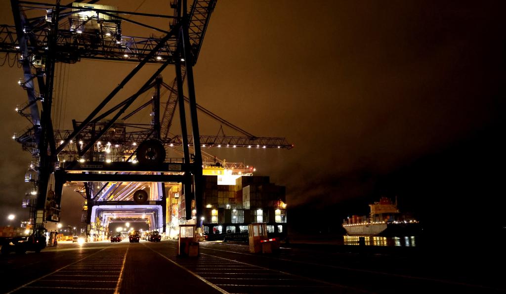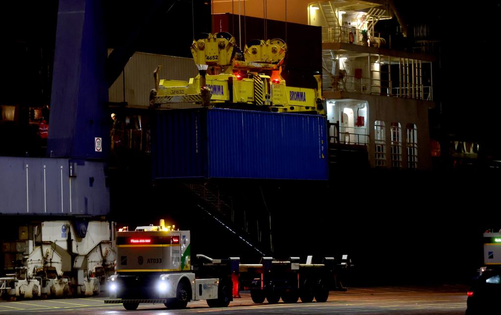 13日、英国のフェリクストウ港でコンテナの荷卸ろし作業をする中欧北極コンテナ直行航路の初便。(ロンドン=新華社記者/李穎)