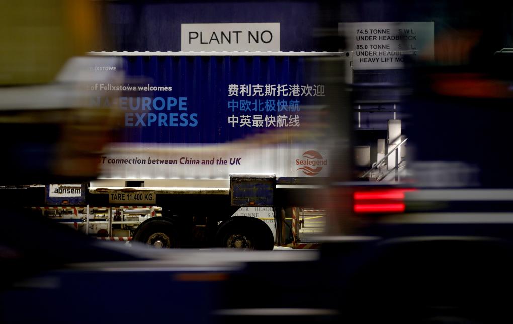 13日、英国のフェリクストウ港に到着した中欧北極コンテナ直行航路の初便から荷降ろしされたコンテナ。(ロンドン=新華社記者/李穎)
