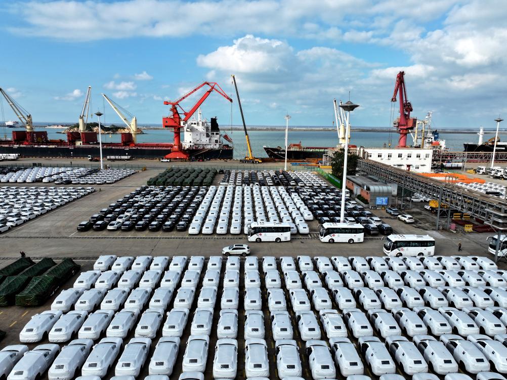 14日、江蘇省連雲港港にある東方港務分公司の埠頭(ふとう)で、船積みを待つ輸出車。(ドローンから、連雲港=新華社配信/王春)